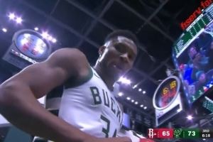 怪兽!字母哥遭三人合围 晃开防守腾空暴起单臂砸扣