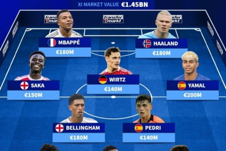前锋:亚马尔(2亿欧)、姆巴佩(1.8亿欧)、哈兰德(1.8亿欧)、萨卡(1.5亿欧)